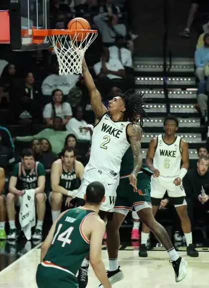 — Force turnovers: Wake Forest’s 3-point shooting has been streaky (but was 11 of 21, a season-high 52.4%, Wednesday against Miami), so forcing tough possessions and turnovers can swing momentum. The Deacons have made less than 30% of their 3-point attempts in nine of 16 games but have scored double-digit 3-pointers in six games.