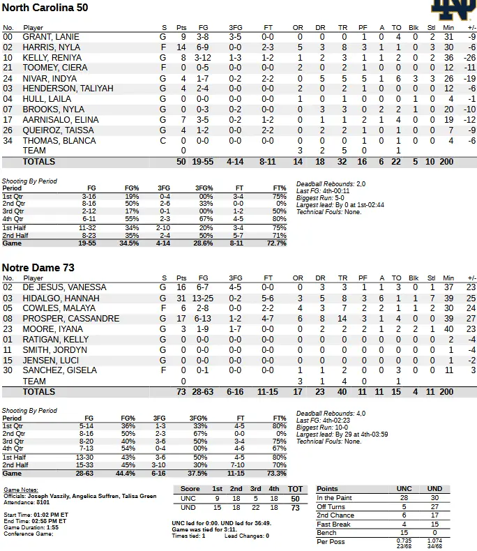 UNC missed its first six shots after the break before an Elina Aarnisalo jumper finally ended a nearly five-minute drought in the middle of a 16–2 Notre Dame run. De Jesus buried three straight 3-pointers during that stretch.