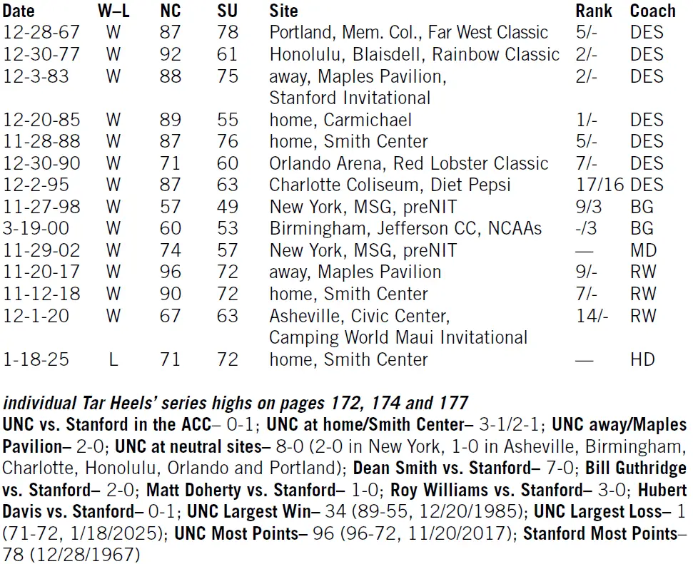 Series: UNC leads 13–1 (see list below), including 2–0 at Maples Pavilion, only losing the last meeting, 72–71 last season on Jan. 18 at the Smith Center on Jaley Blakes’ jumper with 0.9 of a second left.