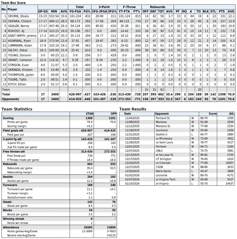 Stanford season statistics