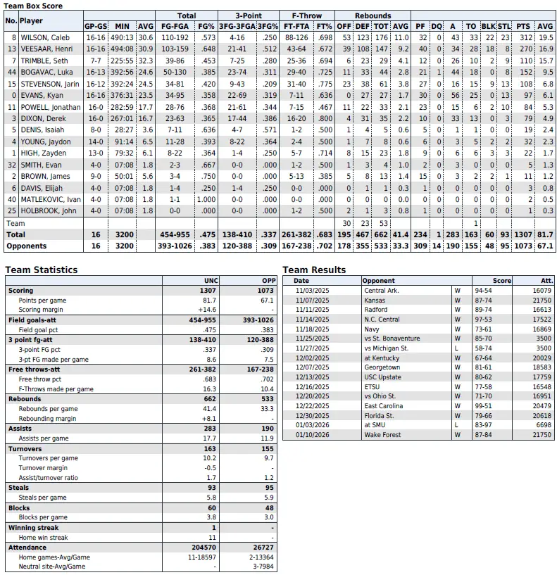 — Caleb Wilson and Henri Veesaar are on pace to become the first teammates in ACC history to each average at least 16 points and at least nine rebounds, and both shoot at least 55% from the floor. They have combined for 36.4 points and 20.2 rebounds per game, with 40 blocks and assists, while shooting 60.7% from the floor. They have produced 44.5% of Carolina’s scoring, 48.8% of the rebounds, 46.9% of the field goals made and 49.7% of the free-throw attempts.