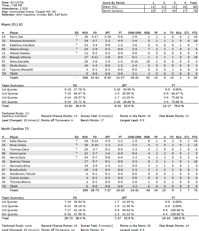 Playing without a national ranking for the first time this season, the Tar Heels (14–5, 3–3 ACC) held Miami to 28 second-half points. That allowed them to win despite 38.4% shooting from the field.