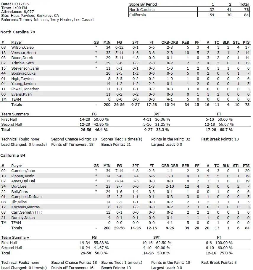 Cal (14–5, 2–4 ACC) never trailed while pushing North Carolina (14–4, 2–3) closer to the NCAA tournament bubble. The Bears knocked down 14 3-pointers, making UNC’s last four opponents a scorching 70 of 156 from beyond the arc.