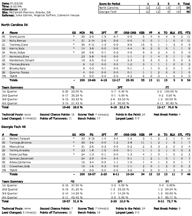 Grant scored UNC’s first five points of the final quarter, with her 3-pointer giving the Tar Heels a 42–33 lead with 6:19 left. After the Jackets pulled within six, a Toomey 3-pointer and an Aarnisalo jumper gave UNC an 11-point lead with 4:13 left before the Heels put the game away at the free-throw line.