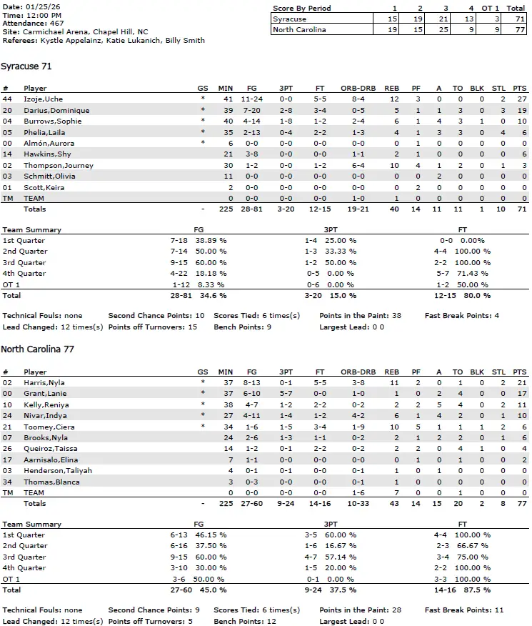 UNC responded in overtime and pulled out a 77–71 victory over the Orange for only the fourth overtime win under Coach Courtney Banghart. It was the Tar Heels’ best win of the season by NET ranking, with Syracuse entering the day at No. 40.