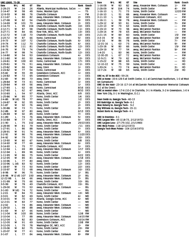 Series: UNC leads 73–28 (see list below), including 23–16 on road and 17–15 in McCamish Pavilion/Alexander Memorial Coliseum.