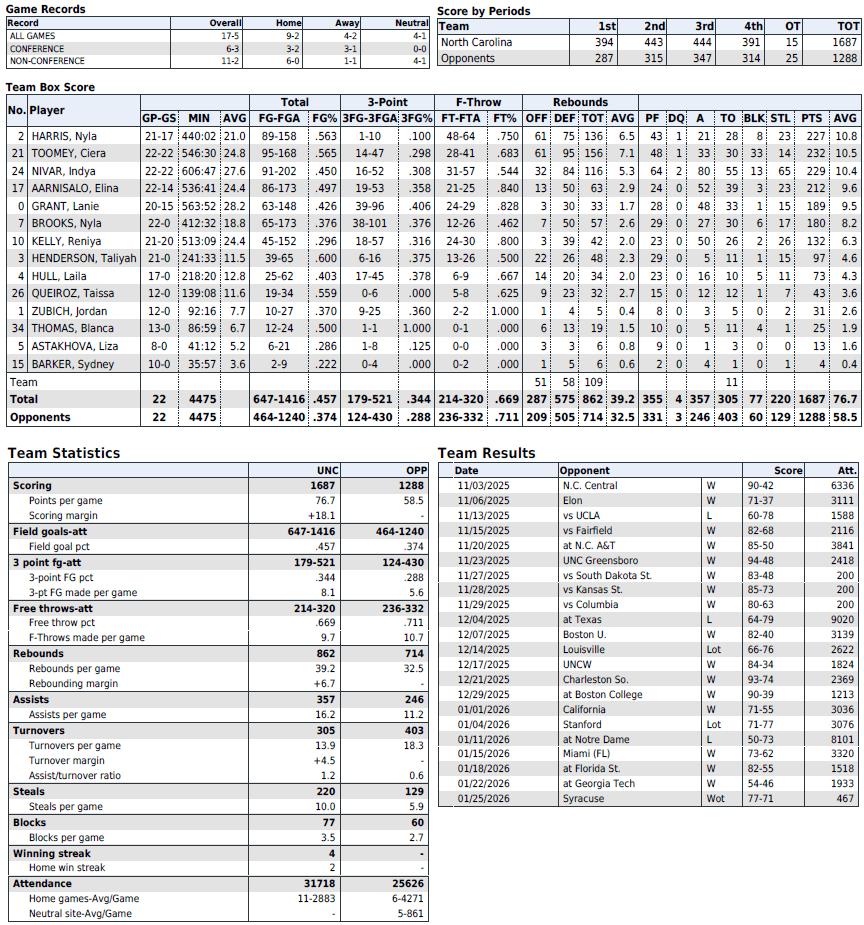UNC season statistics