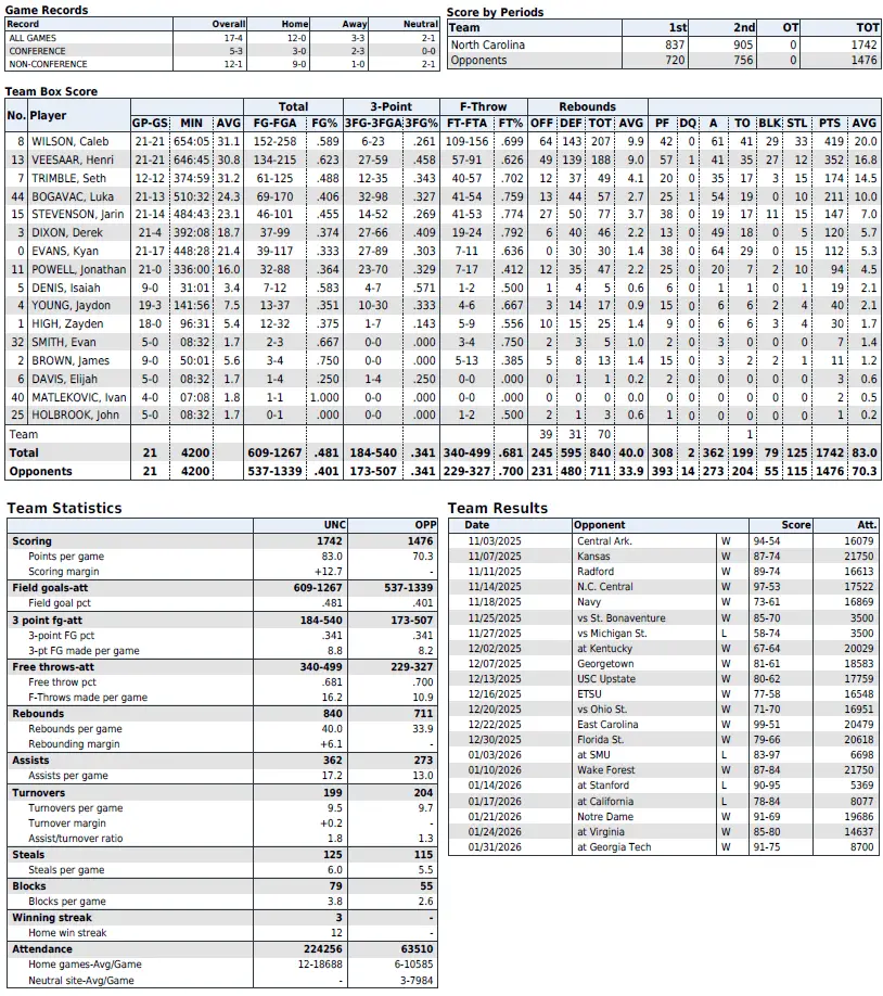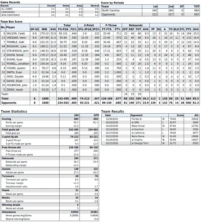 Attack Syracuse’s interior, win the rebounding battle — UNC enters averaging 40.0 rebounds per game, significantly better than Syracuse’s 35.2. The Tar Heels are 34th nationally in rebounding, while Syracuse ranks 223rd. Syracuse just gave up 44 rebounds to N.C. State and gave up a lot of second-chance points. Caleb Wilson and Henri Veesaar should set the tone on the glass.
