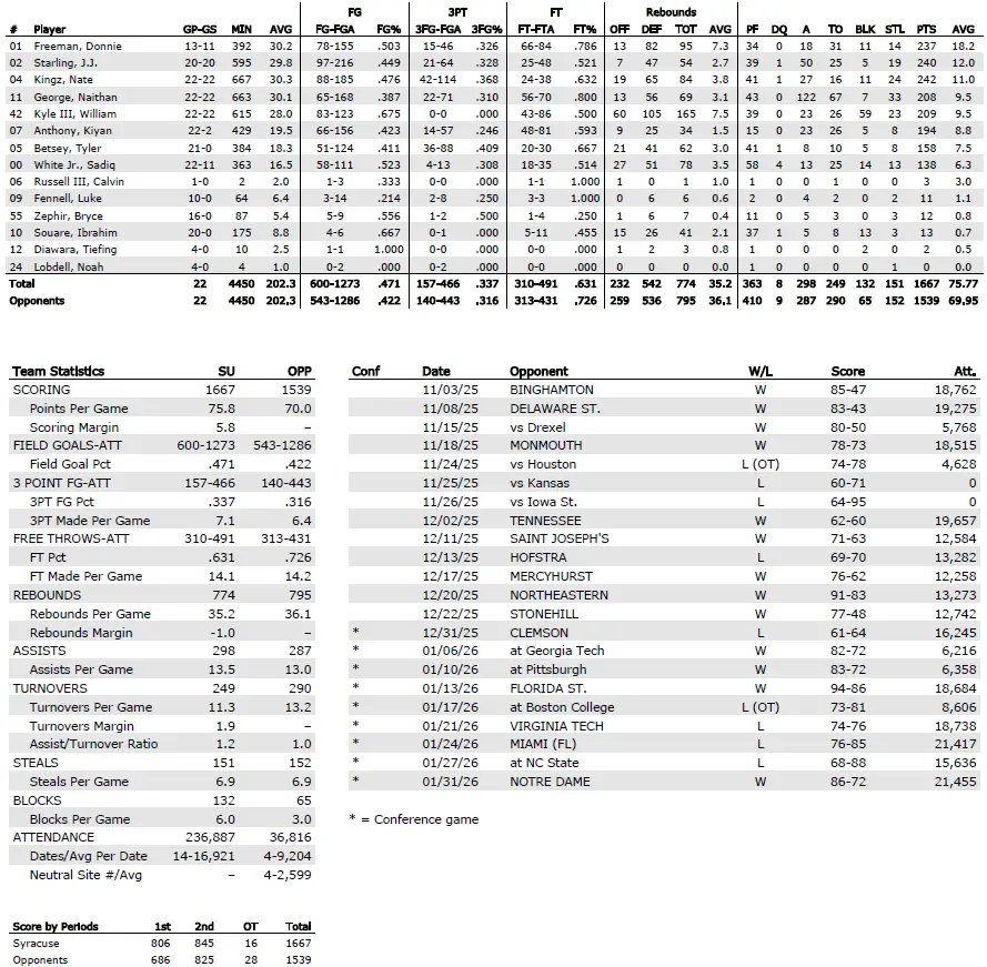 Dictate pace and push the tempo — UNC scores 83 points per game and shoots 48.1% from the field, both superior to Syracuse’s offensive efficiency. Syracuse’s defensive numbers (69.9 points-per-game allowed, 42.2% shooting from the floor allowed) are solid but bend under sustained pace. If UNC forces transition opportunities, Syracuse’s half-court reliance on Donnie Freeman and J.J. Starling becomes less effective.