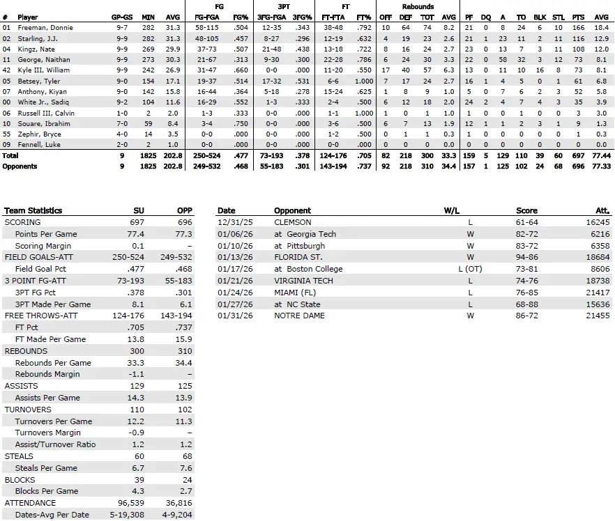 — 4–2 in Quad 3 games: home wins vs. Notre Dame, Florida State and St. Joseph’s; win at Georgia Tech; home loss to Hofstra; loss at Boston College