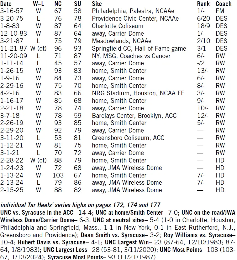 — UNC beat Kansas 87–54 at home on Nov. 7; Syracuse lost 71–60 in Las Vegas on Nov. 25.