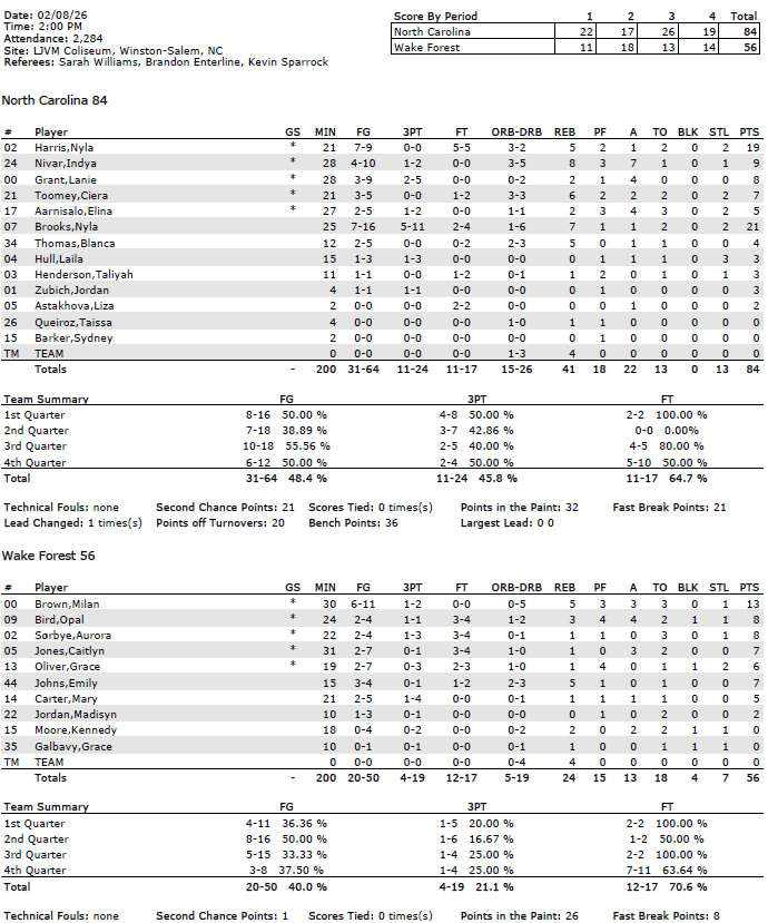 North Carolina responded with a decisive 20–2 run, fueled by two early Brooks 3-pointers and two more from Lanie Grant. The Deacons went more than seven minutes without a field goal, and the Tar Heels led 22–11 after one quarter.
