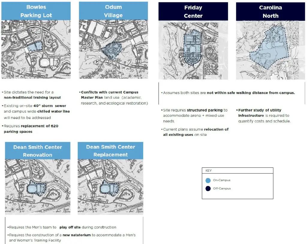 All options call for a 16,000-seat arena. Of the five options for a new arena, the most likely is at the Carolina North site. Others include building on the Bowles Lot, at Odum Village and at the Friday Center.