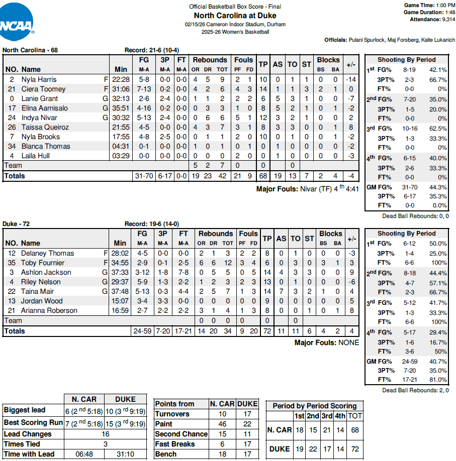 Ciera Toomey (14 points, 6 rebounds) led four Tar Heels in double figures, followed by Indya Nivar (12 points, 6 rebounds, Nyla Brooks (10 points) and Nyla Harris (10 points, team-high rebounds).