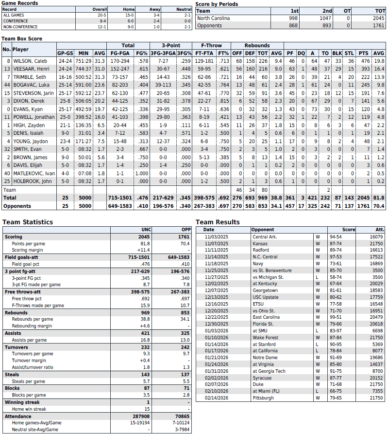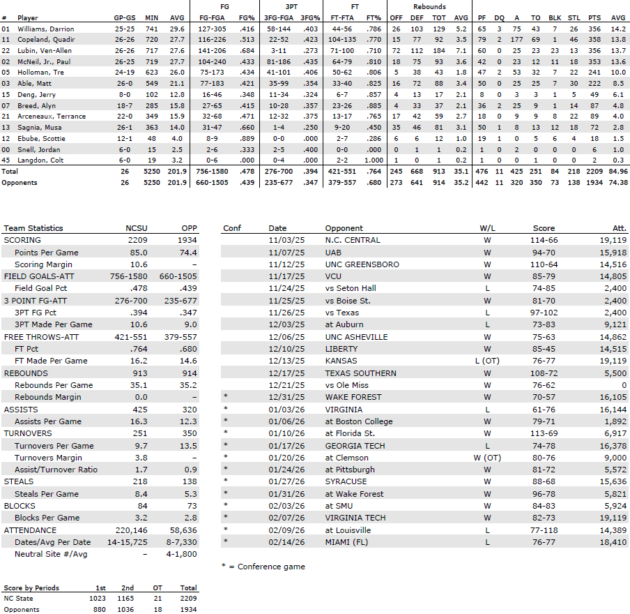Defend without fouling — Letting N.C. State live at the free-throw line keeps the Wolfpack in the game even if UNC is playing better. Stay disciplined on closeouts and avoid cheap fouls. Against State’s guards, the Tar Heels have to avoid over-helping on defense and avoid leaving shooters open, since the Pack leads the ACC in 3-point shooting percentage (39.4%) and ranks second in 3-pointers per game (10.6). Quadir Copeland is a talented playmaker who can make very difficult passes look routine.