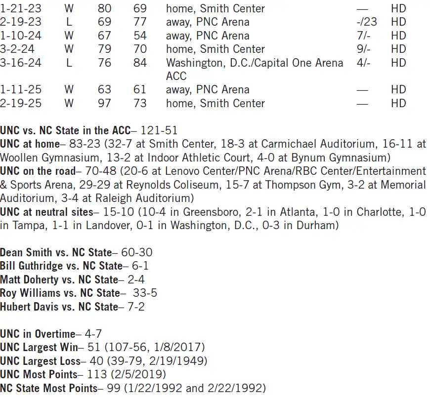 — Both played at SMU: UNC lost 97–83 on Jan. 3, State won 84–83 on Feb. 3