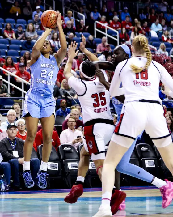 CHARLOTTE — With a chef’s kiss — several, actually — No. 5-seed North Carolina easily moved into the quarterfinals of the ACC tournament. Graduate forward Jae’Lyn Withers’ signature celebration after 3-pointers spelled doom for No. 12-seed Notre Dame as he scored 21 points and seven 3-pointers, both career-highs, and the Tar Heels rolled to a 76–56 second-round victory Wednesday at the Spectrum Center.