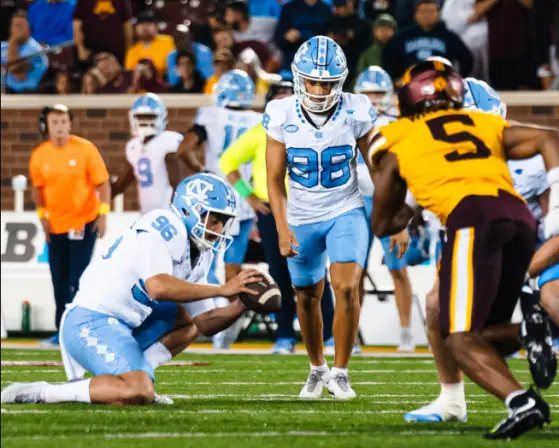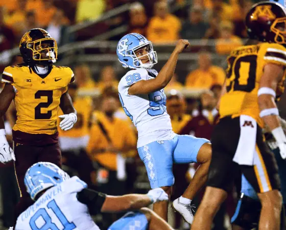 MINNEAPOLIS — In recent years, Carolina fans have been told that the defense is better, but those promises have never translated into performance on the field. At least for most of the opener, the Tar Heels unit under first-year coordinator Geoff Collins proved their mettle. The unit forced five three-and-outs to help UNC overcome Max Johnson’s injury to earn a 19–17 victory Thursday night at Huntington Bank Stadium behind four second-half Noah Burnette field goals.
