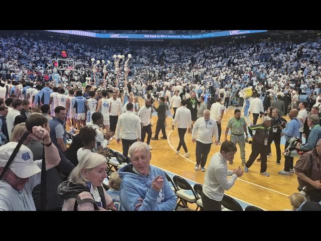 The final seconds of #UNC's win from courtside, including Davis greeting Roy Williams after the game