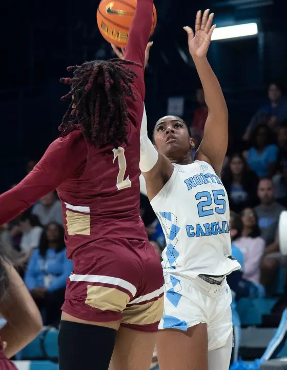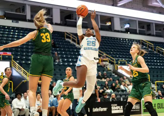 ESTERO, Fla. — Carolina’s shooting was as cold as the hockey arena for most of Friday afternoon before shots finally fell and the No. 18 Tar Heels staged an amazing fourth-quarter comeback. The Tar Heels trailed by as many as 13 points but finished the game with a 20–6 run, taking the lead in the final two minutes on their way to a thrilling 54–51 victory over Vermont in the first round of the Gulf Coast Showcase at a chilly Hertz Arena.