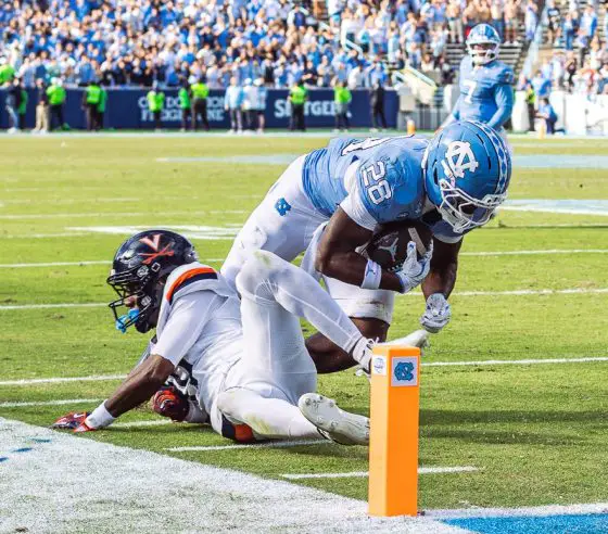 North Carolina continues to lose in heartbreaking fashion, this time missing a potential game-winning two-point conversion by inches. After matching Virginia’s touchdown in the first overtime, the Tar Heels went for two and quarterback Gio Lopez passed to Benjamin Hall, whose knee went down just before he got the ball over the goal line.